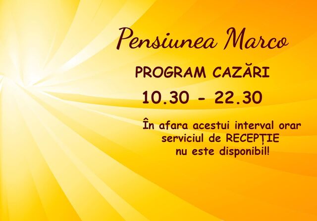 Bine ați venit la Pensiunea Agroturistică Marco, un refugiu în inima naturii. Cu un program de cazare între orele 10:30 și 22:30, vă oferim un mediu prielnic pentru relaxare, unde vă puteți bucura de farmecul rural în timpul zilei și seara. Oferim servicii de cazare confortabile și ospitalitate autentică, vă așteptăm să vă transformați fiecare moment într-o amintire de neuitat. Vă rugăm să rețineți că în afara intervalului de cazare menționat, serviciul nostru de cazare este indisponibil.